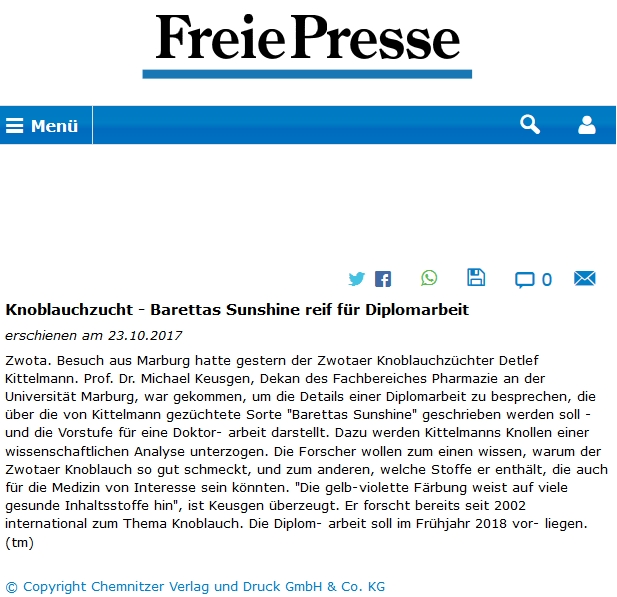 Zwota. Besuch aus Marburg hatte gestern der Zwotaer Knoblauchzüchter Detlef Kittelmann. Prof. Dr. Michael Keusgen, Dekan des Fachbereiches Pharmazie an der Universität Marburg, war gekommen, um die Details einer Diplomarbeit zu besprechen, über die von Kittelmann gezüchtete Sorte "Barettas Sunshine" geschrieben werden soll - und die Vorstufe für eine Doktorarbeit darstellt. Dazu werden Kittelmanns Knollen einer wissenschaftlichen Analyse unterzogen. Die Forscher wollen zum einen wissen, warum der Zwotaer Knoblauch so gut schmeckt, und zum anderen, welche Stoffe er enthält, die auch für die Medizin von Interesse sein könnten. "Die gelb-violette Färbung weist auf viele gesunde Inhaltsstuffe hin", ist Keusgen überzeugt. Er forscht bereits seit 2002 international zum Thema Knoblauch. Die Diplomarbeit soll im Frühjahr 2018 vorliegen (tm)