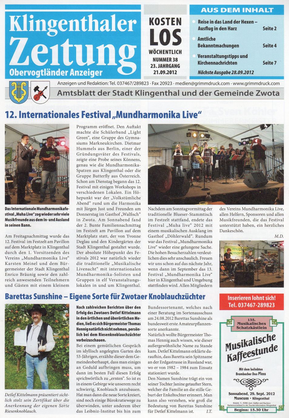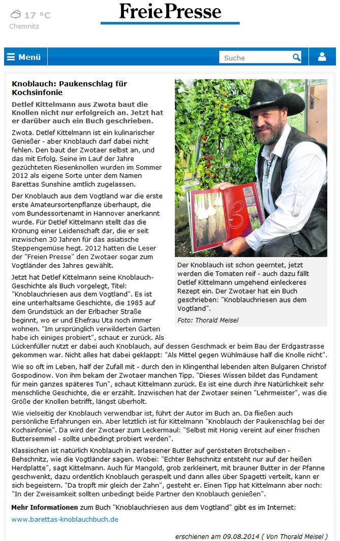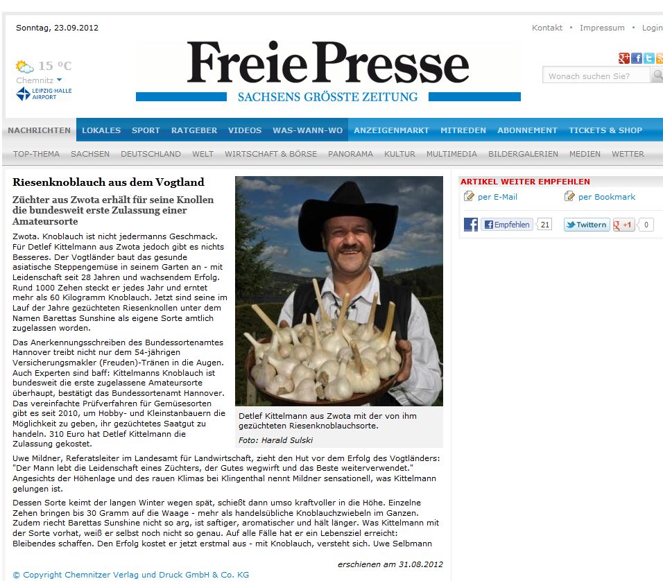Detlef Kittelmann, seit mehr als 30 Jahren Knoblauchzüchter, war 2011 als erstem Amateurpflanzenzüchter eine neue Sorte anerkannt worden: "Barettas Sunshine". Die hat ihn inzwischen international bekannt gemacht. Für seine Zuchtergebnisse interessieren sich Universitäten wie Marburg, Graz und Kiew. "Meine Züchtung kommt der Wildform ziemlich nahe", erklärt Kittelmann. Der Zwotaer Knoblauch ist hochwertig und widerstandsfähig zugleich. Das zeigte sich erst wieder in den vergangenen Monaten, als Zwiebel- und Knoblauchzüchter in West- und Mitteleuropa witterungsbedingt Verluste bis zu 50 Prozent zu verzeichnen hatten. Kittelmann blieb davon verschont.