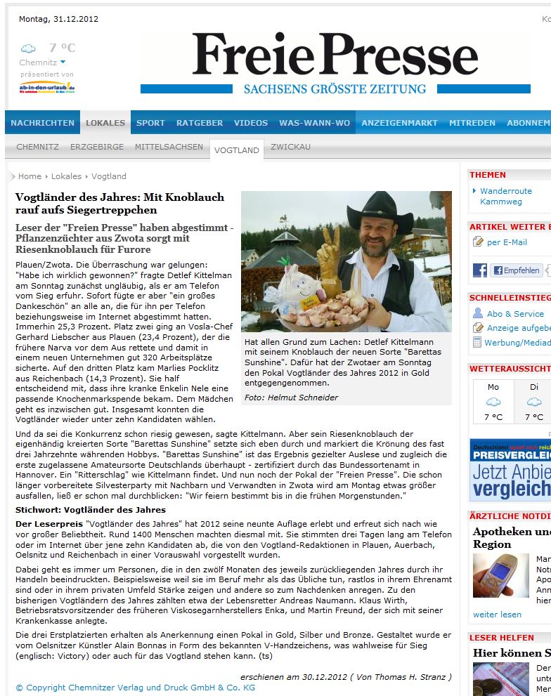 Vogtländer des Jahres. Mit Knoblauch rauf auf's Siegertreppchen