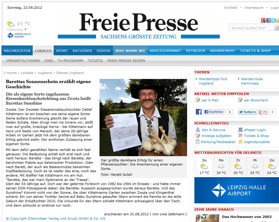 Zwota. Detlef Kittelmann ist ein kulinarischer Genießer - aber Knoblauch darf dabei nicht fehlen. Den baut der Zwotaer selbst an, und das mit Erfolg. Seine im Lauf der Jahre gezüchteten Riesenknollen wurden im Sommer 2012 als eigene Sorte unter dem Namen Barettas Sunshine amtlich zugelassen.