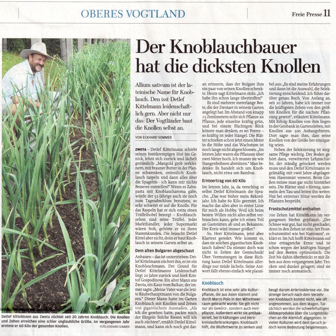 Der Knoblauch aus dem Vogtland war die erste Amateursortenpflanze überhaupt, die vom Bundessortenamt in Hannover anerkannt wurde. Für Detlef Kittelmann stellt das die Krönung einer Leidenschaft dar, die er seit inzwischen 30 Jahren für das asiatische Steppengemüse hegt. 2012 hatten die Leser der "Freien Presse" den Zwotaer sogar zum Vogtländer des Jahres gewählt.